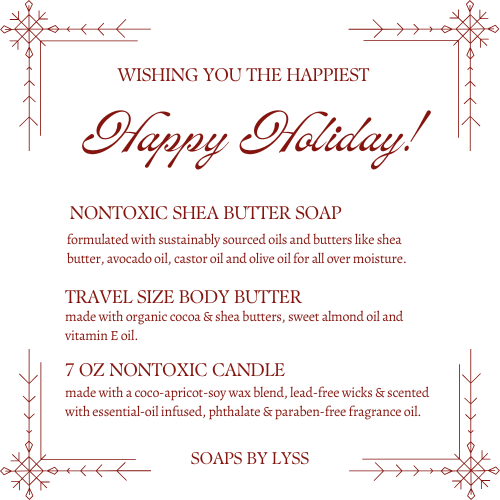 One (7 oz) Nontoxic Candle, one shea butter soap bar & a travel size cocoa & shea Body Butter.